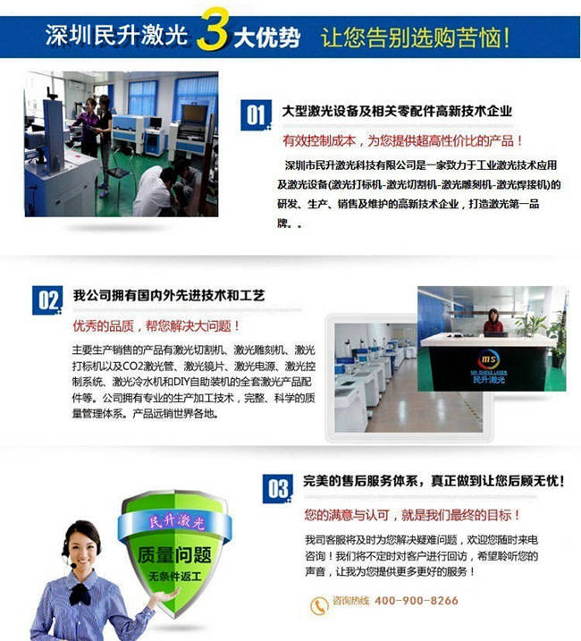 第四:这也是其中非常重要的一点,那就是质量跟机器的稳定性。现在的产品更新换代的特别快,研发的时间也比较短,机型也是多样化,如何能保质保量,维护企业信誉,如何赢得客户的信赖和好评是摆在每个厂商面前的艰巨任务,所以机器的性能质量与稳定是选购加工设备的基础,要尽量选择那种知名度,高好评多、有完善的售后服务体系、售后服务网点多、而且要通过国家合格检查并且经过长期市场检验的品牌,不能因为贪图价格去购买质量低劣,没有售后服务的产品,这会给企业带来严重的后果。现在市场上每个企业的售后服务千差万别,保修的也是时候各有不同。在售后服务上,民升激光切割机_机器保修一年,终身维护。民升激光不仅给客户提供有效的日常维修,针对机器与激光软件,民升激光制作了一系列的配套教学视频,帮助客户尽快上手。